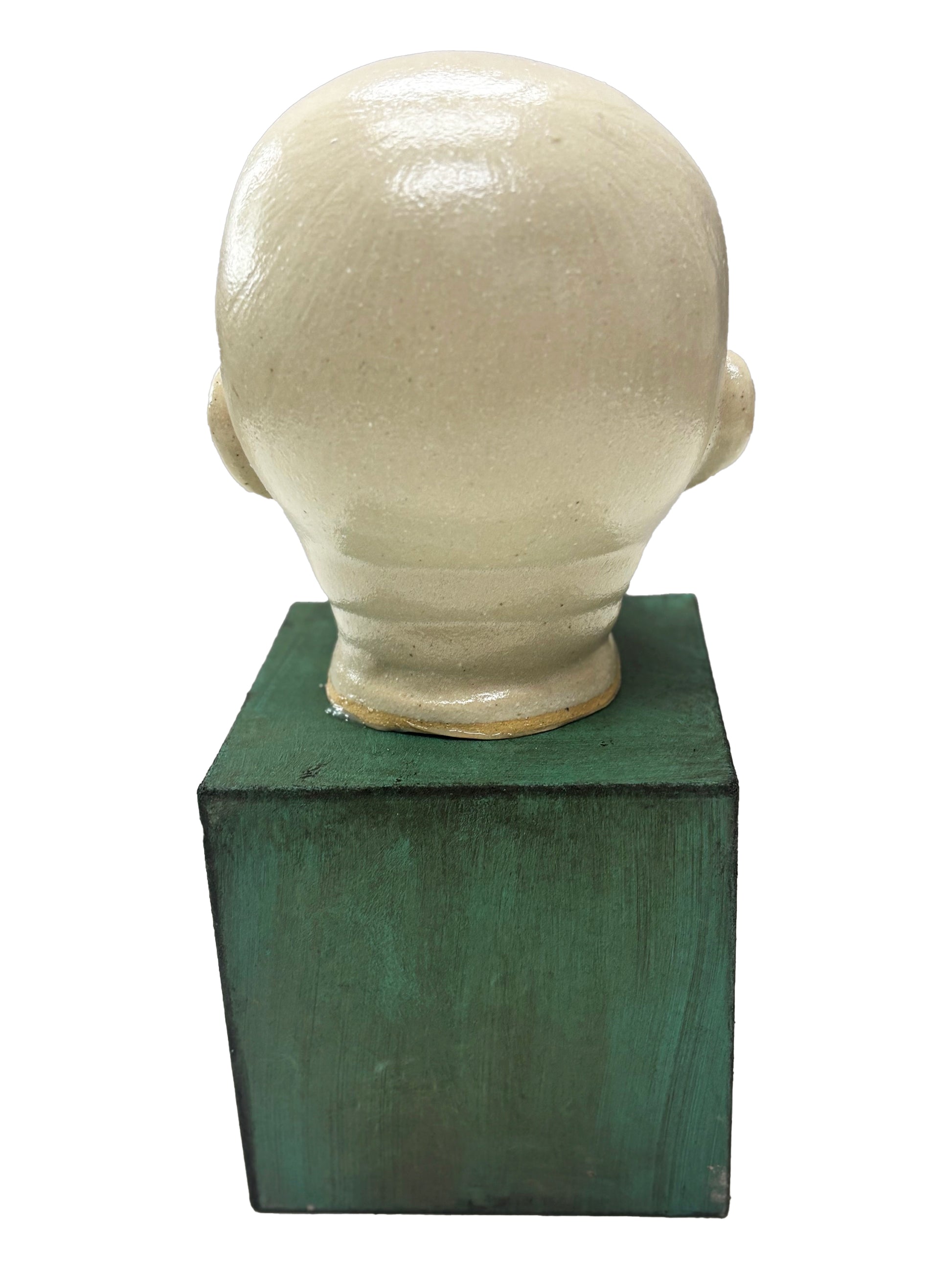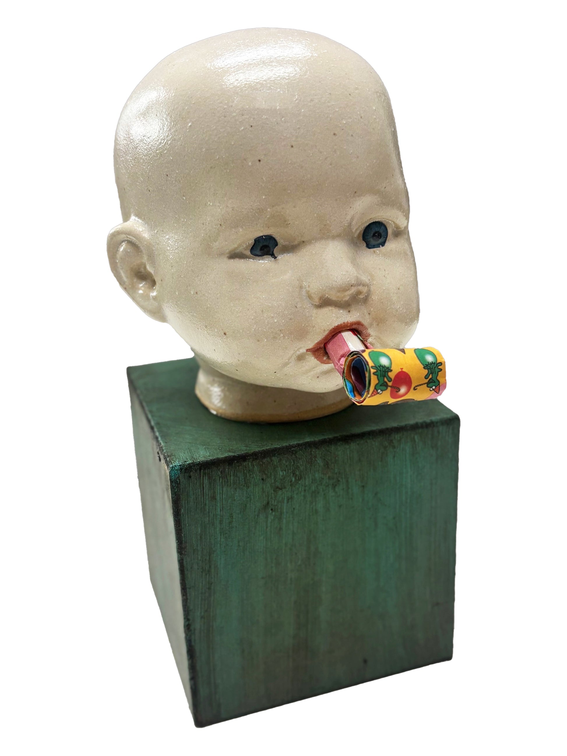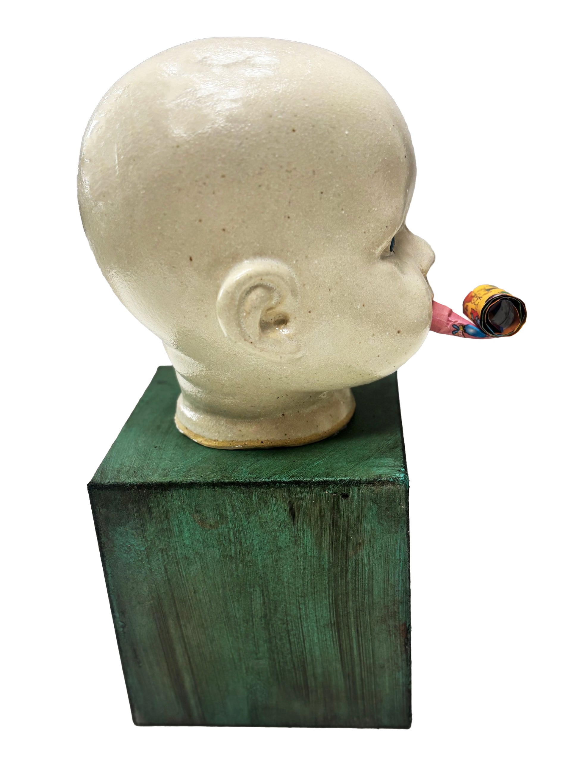 Cabecinha de criança em cerâmica soprando uma Língua de Sogra. A base é em MDF, 11 x 11 cm. Altura total da peça é 25 cm