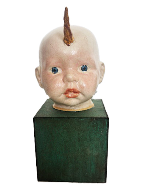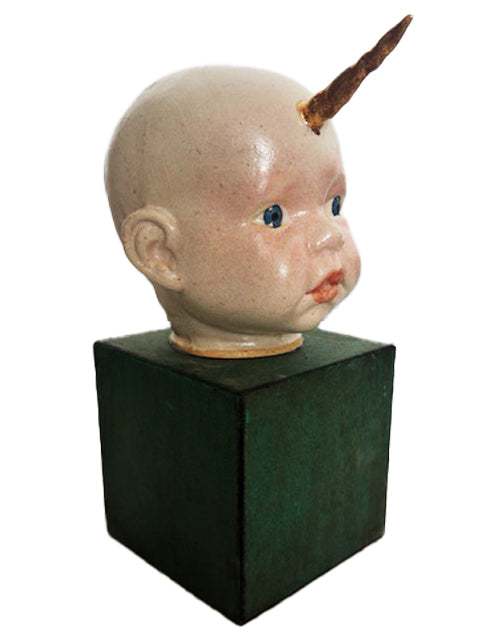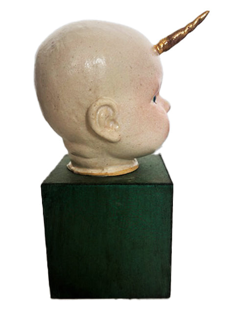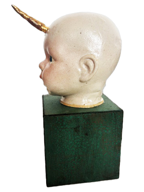 Cabecinha de criança em cerâmica com chifre em ouro.. A base é em MDF, 11 x 11 cm. Altura total da peça é 25 cm.