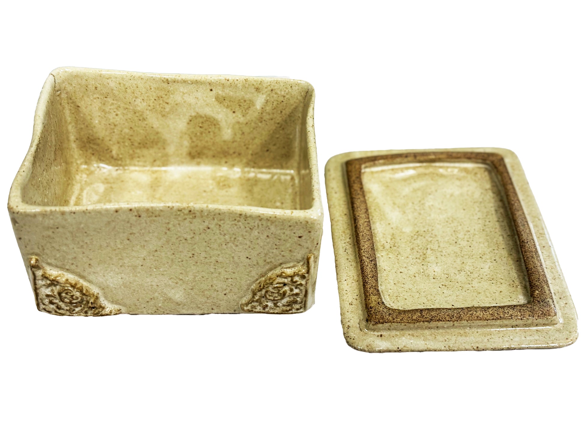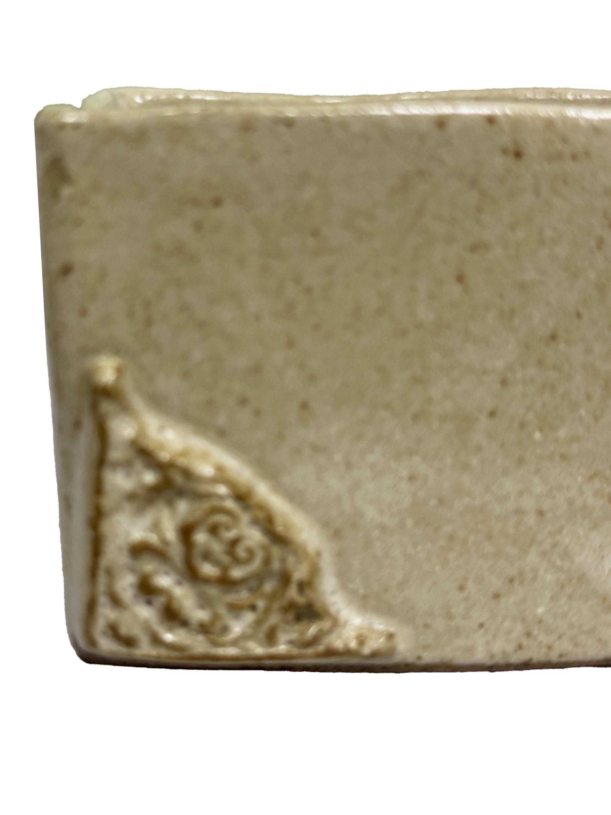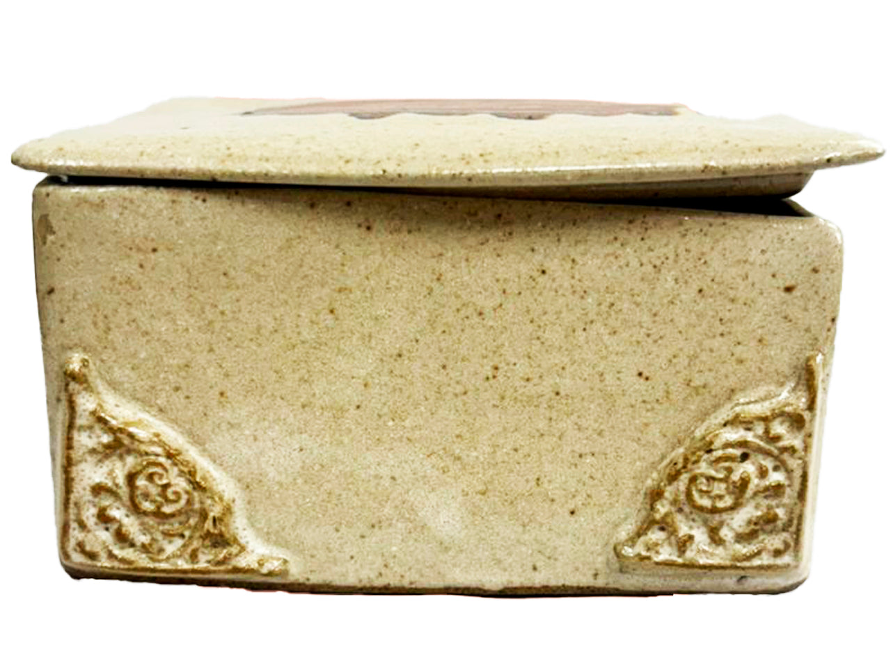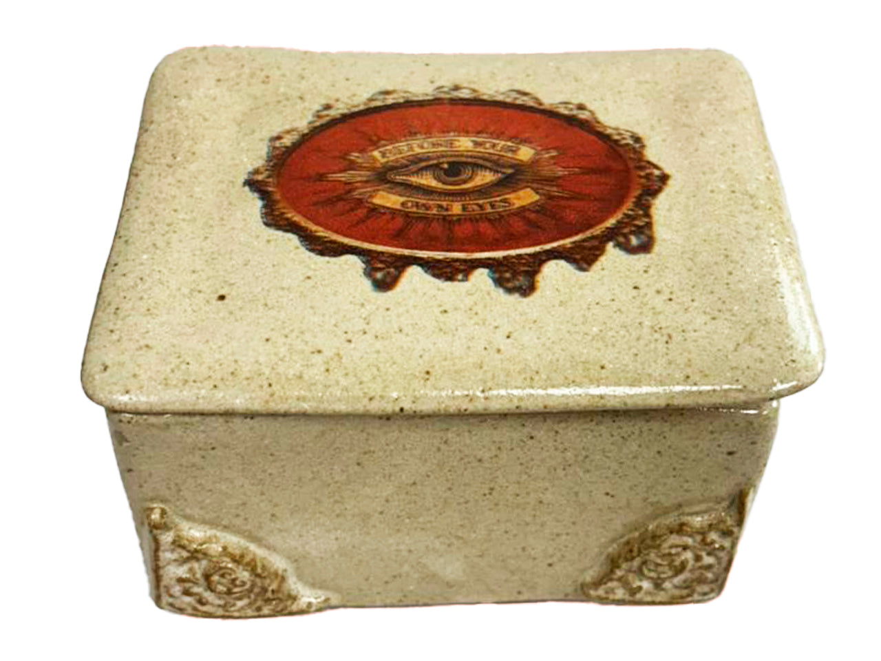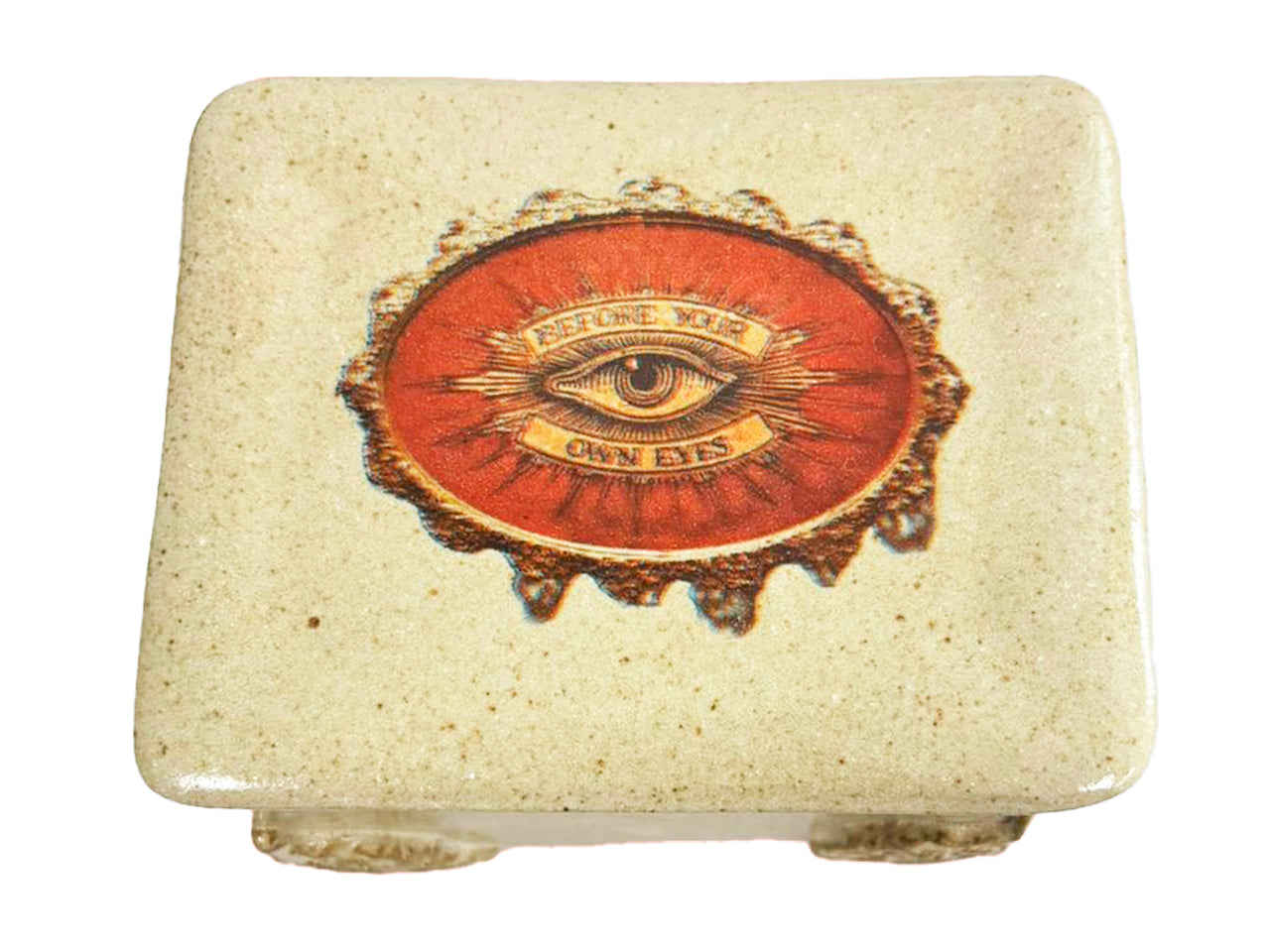 A caixinha mede 10 x 8, com 6 cm de altura, tem arabescos nos cantos e estampa Olho Místico em moldura.