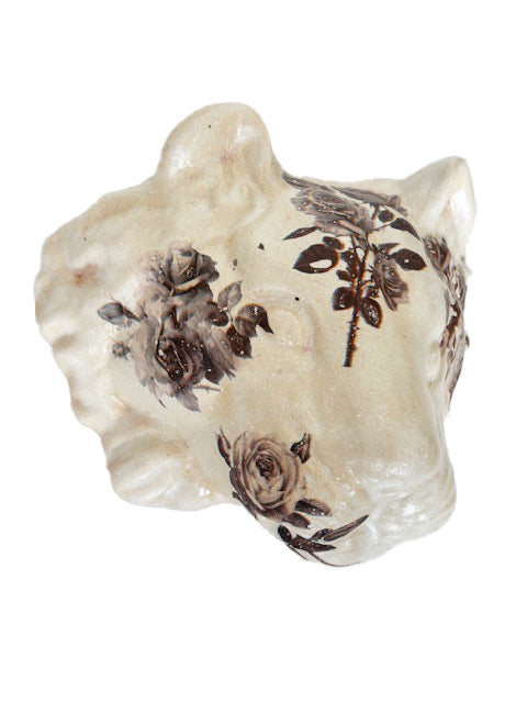 Cabecinha de leão com abertura para se colocar flores ou plantas. É de pendurar na parede, mas pode ser colocada sobre uma mesa, por exemplo. Medidas aproximadas: 16 X 16 cm, profundidade 11 cm