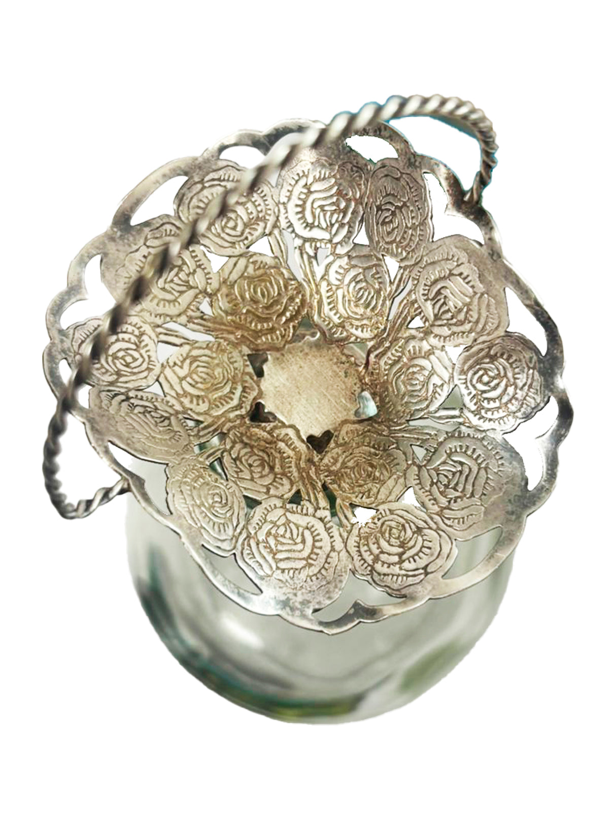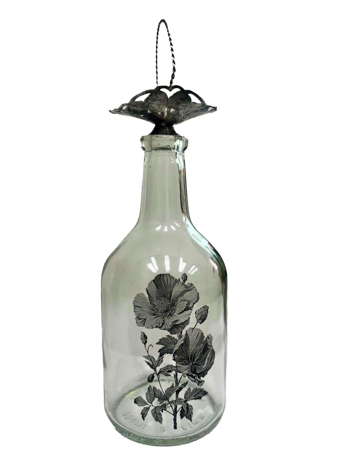 Garrafa com aproximadamente 30 cm de altura, base 9 cm. Tem pequena cesta de metal filigranado garimpada no topo. Peça única e irreproduzível. Uma vez esgotada, pode ter outra parecida, mas jamais igual.