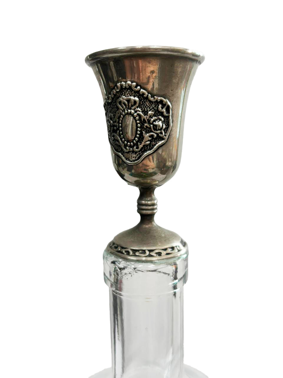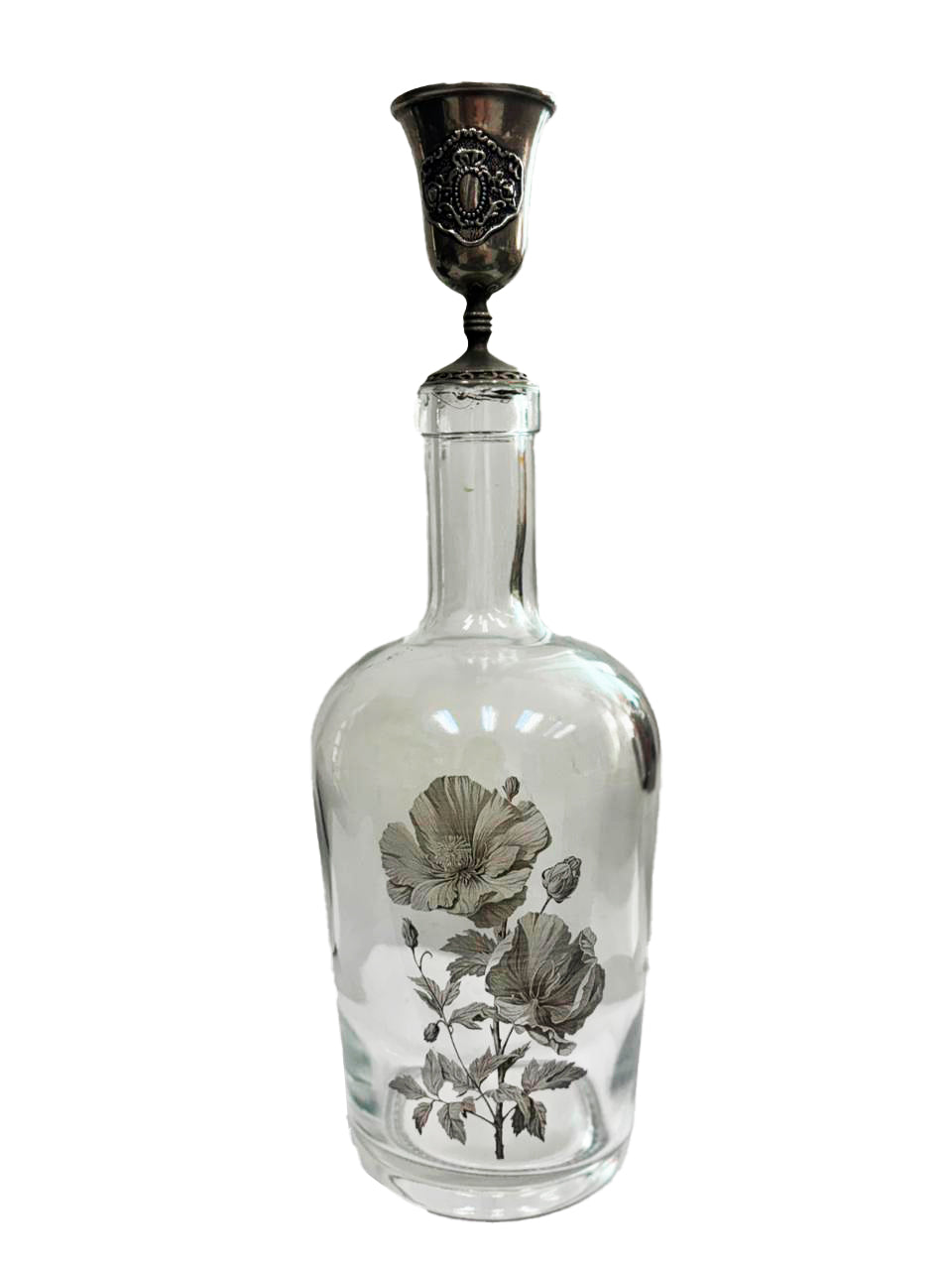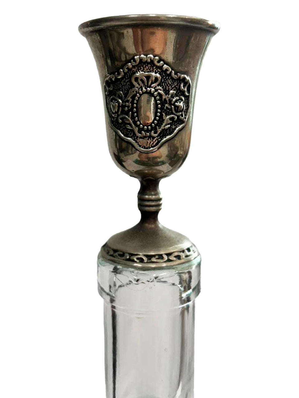 Garrafa com aproximadamente 31 cm de altura, base 8 cm. Leva metal (cálice?) garimpado no topo. Peça única e irreproduzível. Uma vez esgotada, pode ter outra parecida, mas jamais igual.