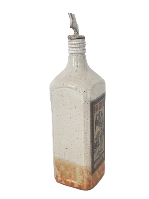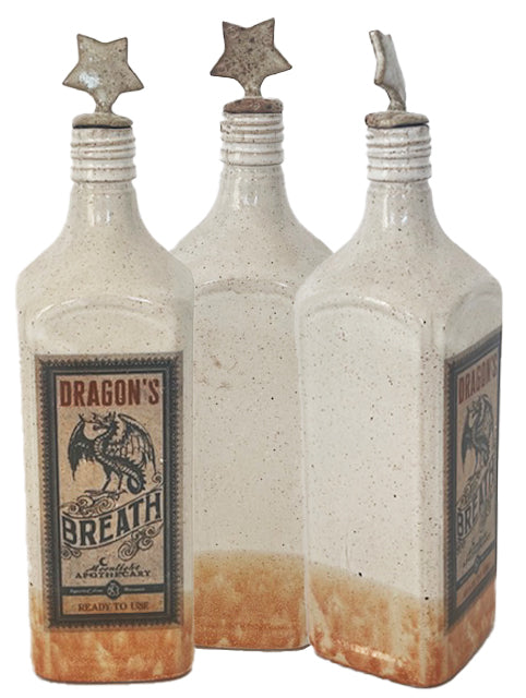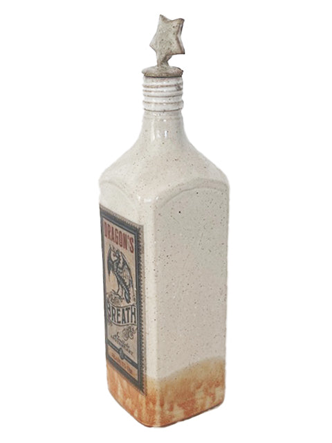 Bebida fictícia de nome Dragons Breath (Bafo de Dragão) em garrafa de cerâmica. Tem aproximadamente 23 cm de altura (sem a tampa) e base 7x7.