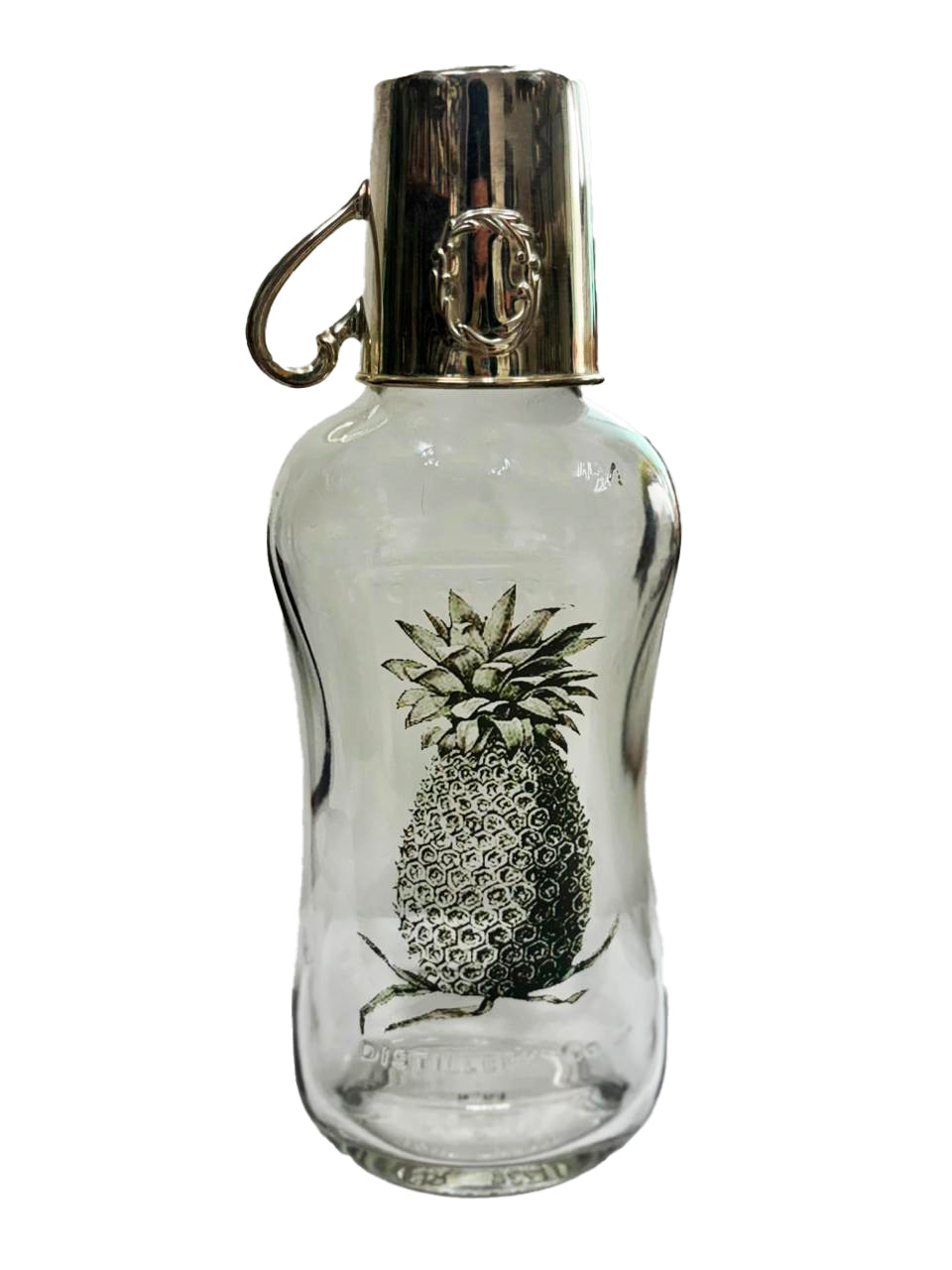 Garrafa com aproximadamente 26 cm de altura, base 8 cm. Com uma canequinha de metal garimpada no topo, estampa um desenho vintage de abacaxi. Peça única e irreproduzível. Uma vez esgotada, pode ter outra parecida, mas jamais igual.