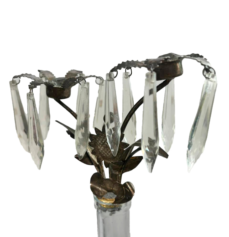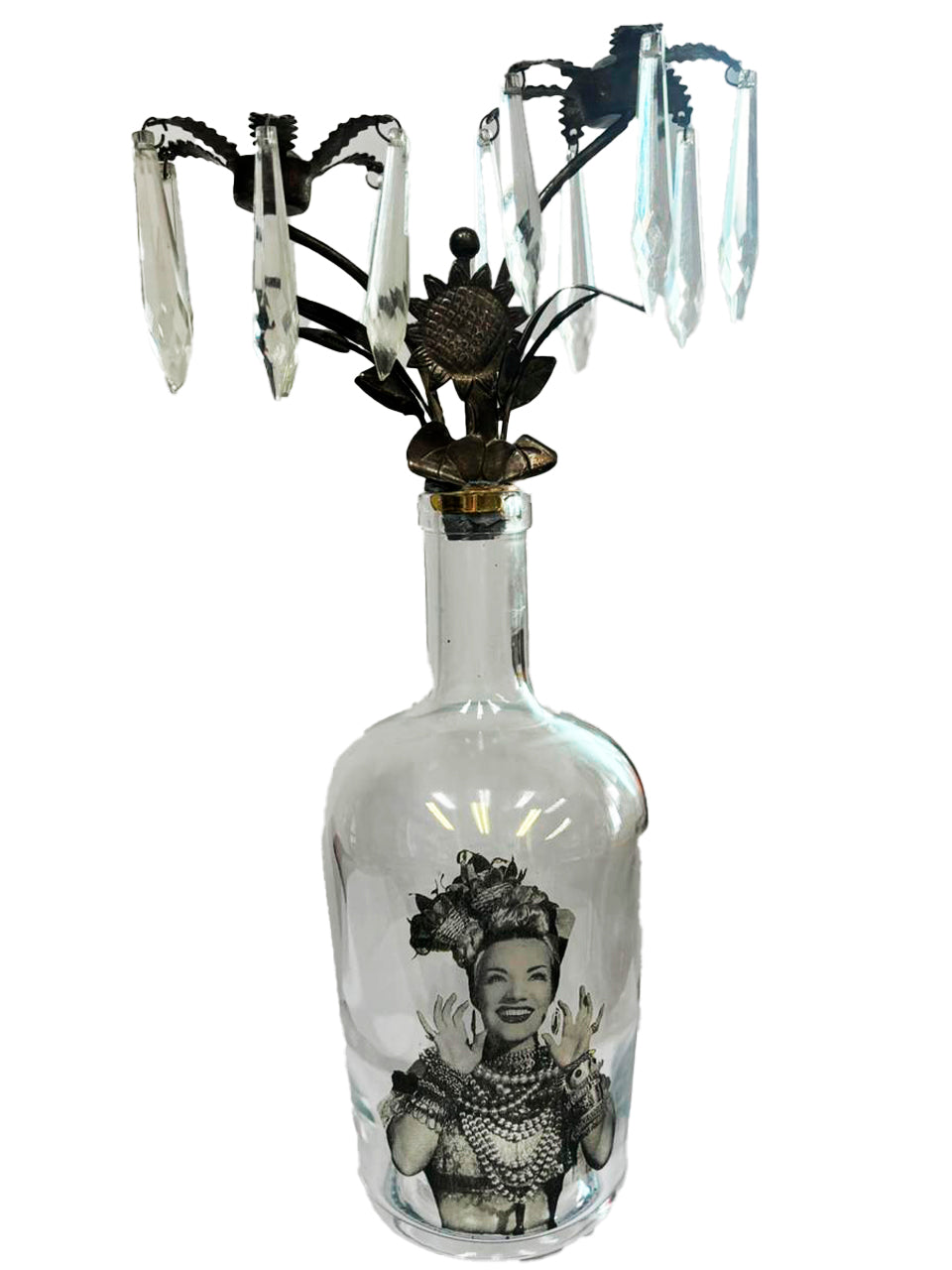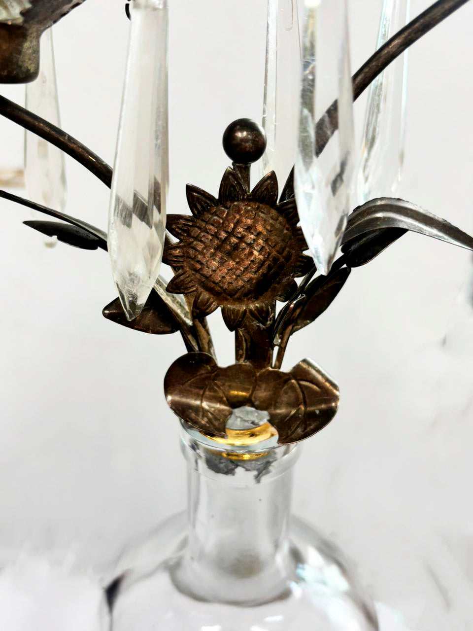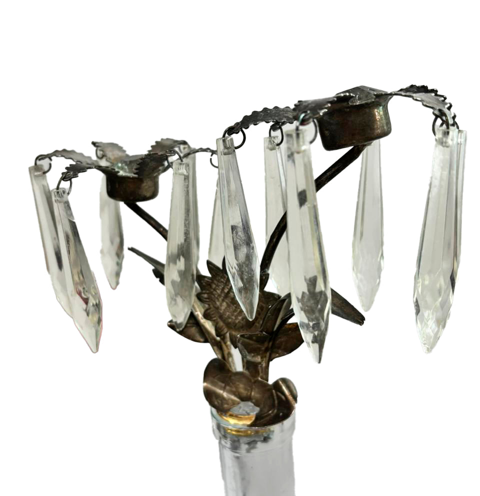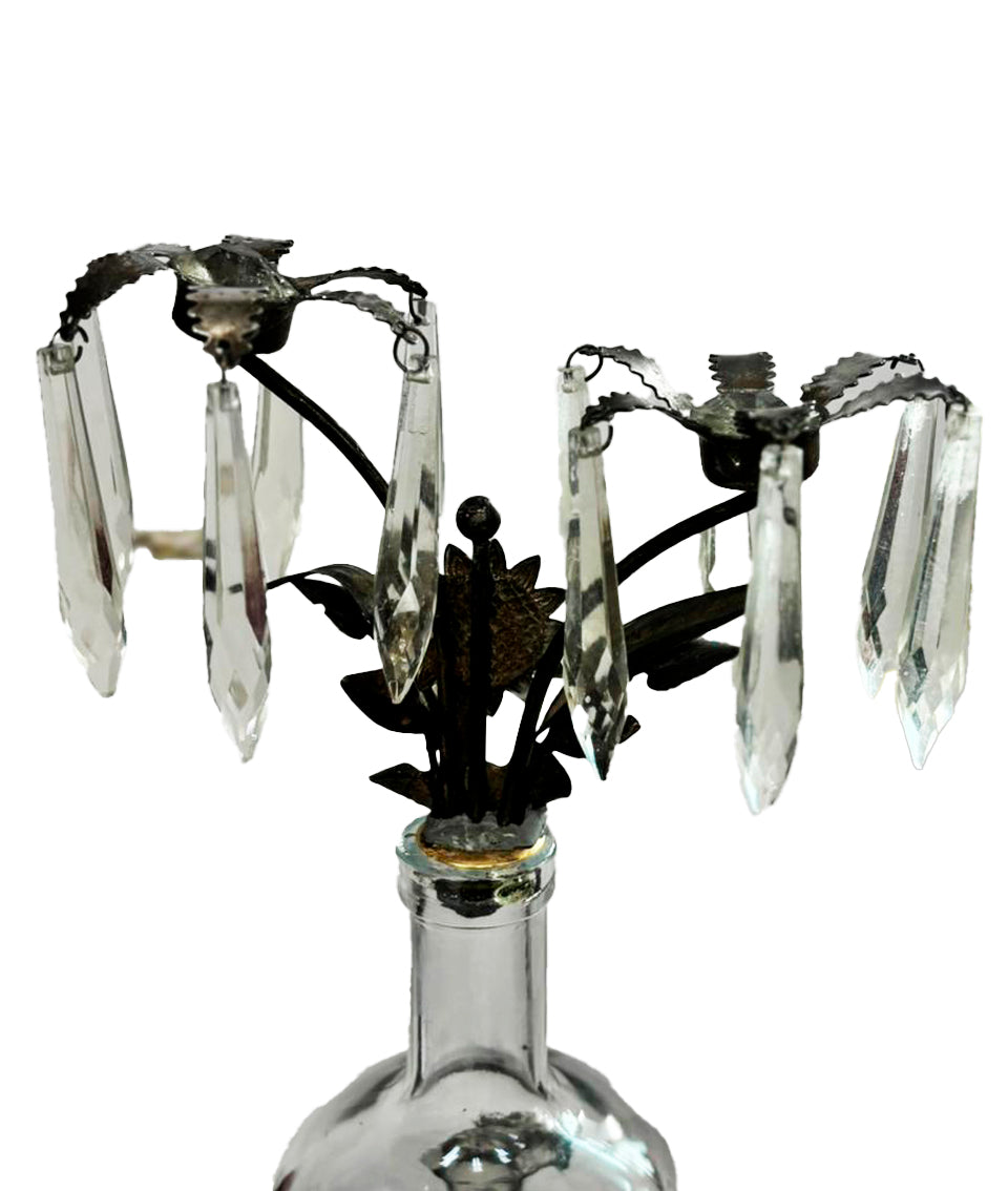 Garrafa com aproximadamente 36 cm de altura, base 8 cm. Algo que pode ter sido um castiçal no topo. Cristais de antigo lustre complementam a alegoria. Peça única e irreproduzível. Uma vez esgotada, pode ter outra parecida, mas jamais igual.