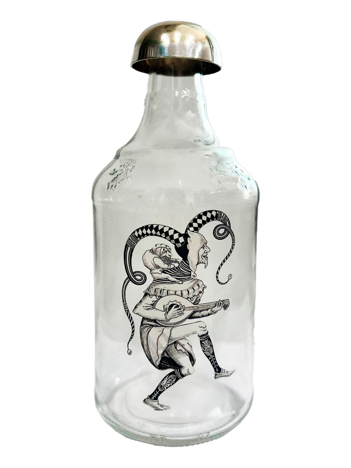 Garrafa com aproximadamente 22 cm de altura, base 9 cm. Metal garimpado no topo. Estampa bobo da corte de carta de tarot. Peça única e irreproduzível. Uma vez esgotada, pode ter outra parecida, mas jamais igual.
