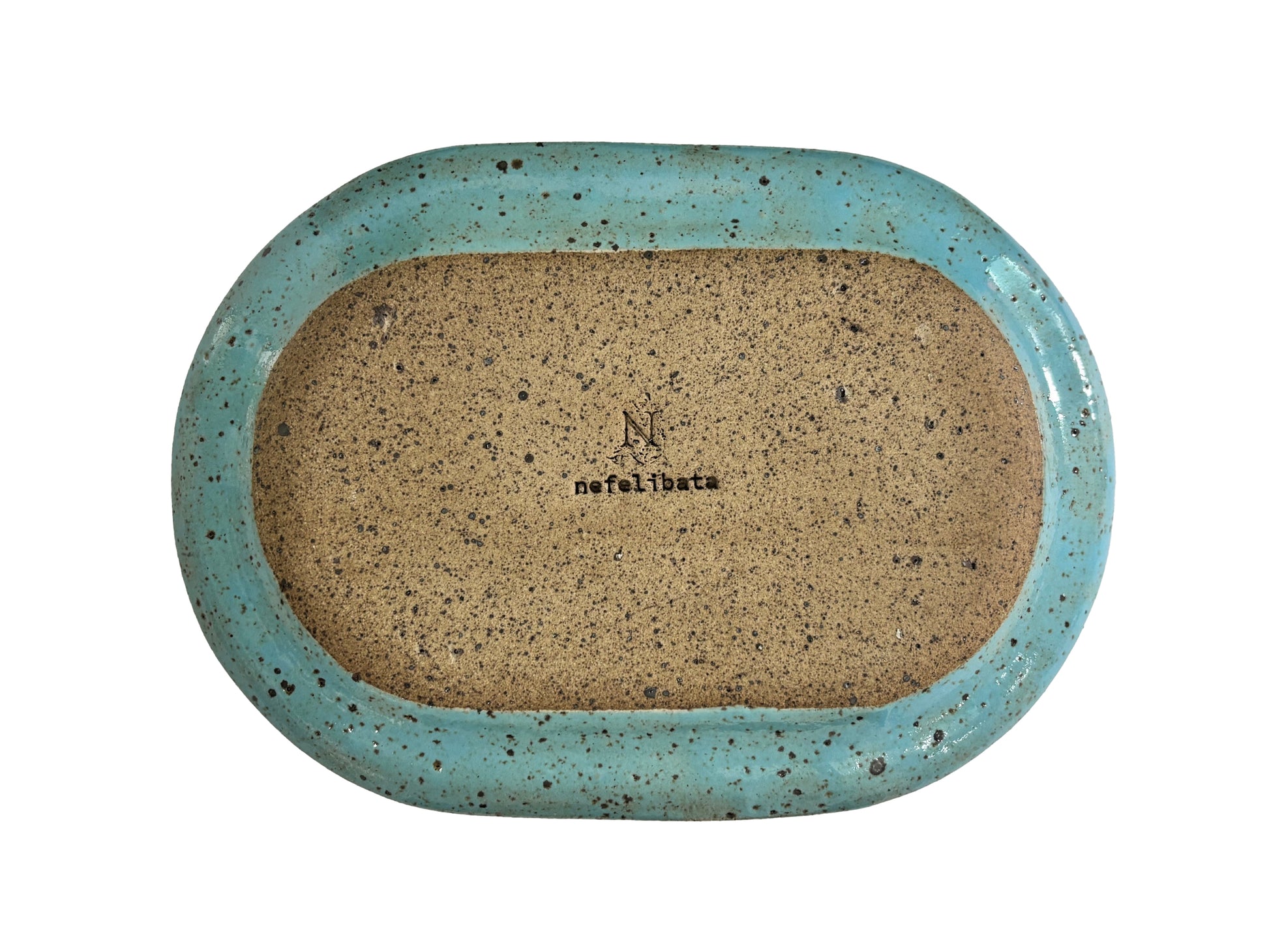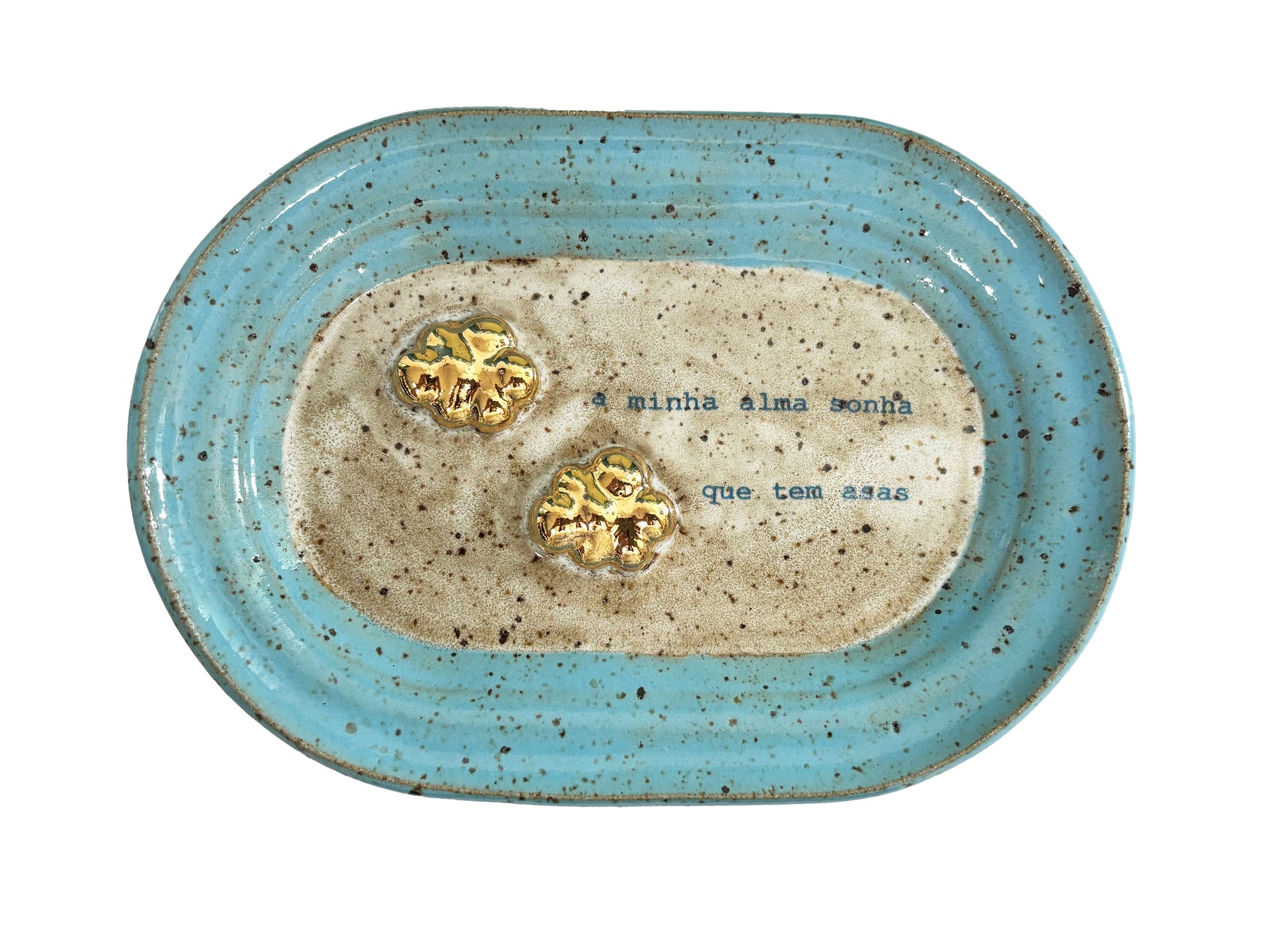 Esse pratinho feito à mão em cerâmica mede 18 x 12, e tem "nuvenzinhas" douradas e os dizeres: a minha alma sonha que está no céu.