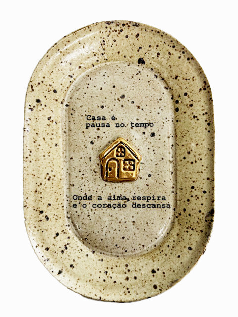 Esse pratinho feito à mão em cerâmica mede 18 x 12, e tem uma casinha pintada a ouro no centro, além dos dizeres: Casa é pausa no tempo, onde a alma respira e o coração descansa. Vem com suporte de parede.