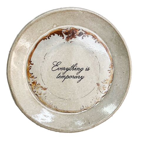 Esse pratinho é feito em cerâmica à mão e mede 13 cm. Estampa os dizeres "Everithig is temporary" (Tudo é temporário)