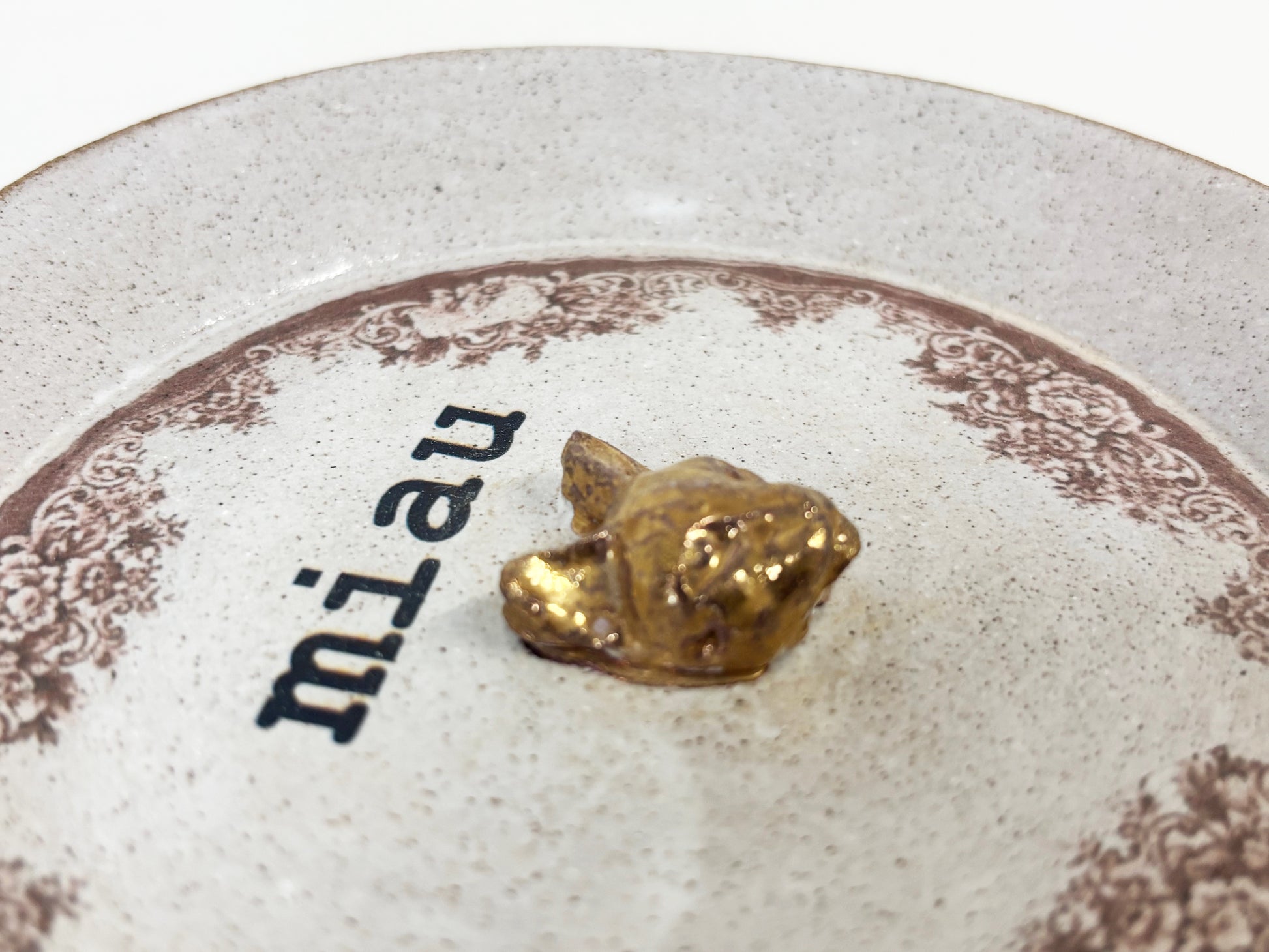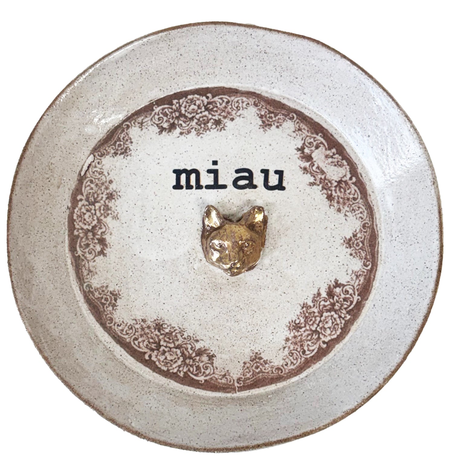 Esse pratinho é feito em cerâmica à mão e mede 13 cm. Tem a cabeça de um gatinho em relevo pintada a ouro no centro de moldura simulando prato antigo. Vem com suporte de parede.