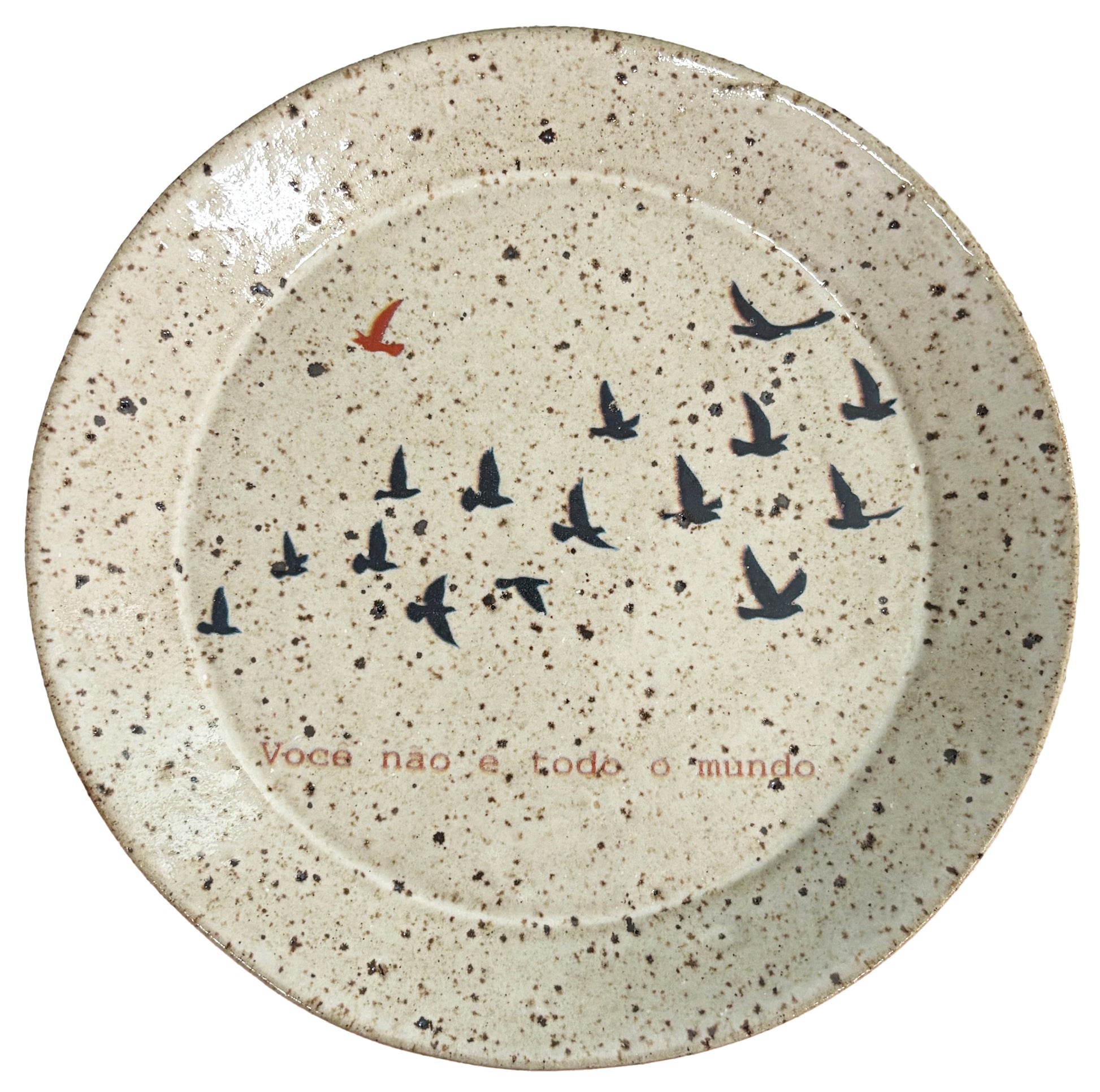 Esse pratinho é feito em cerâmica à mão e mede 13 cm. Estampa revoada de pássaros onde um deles escolhe outo caminho para percorrer.
