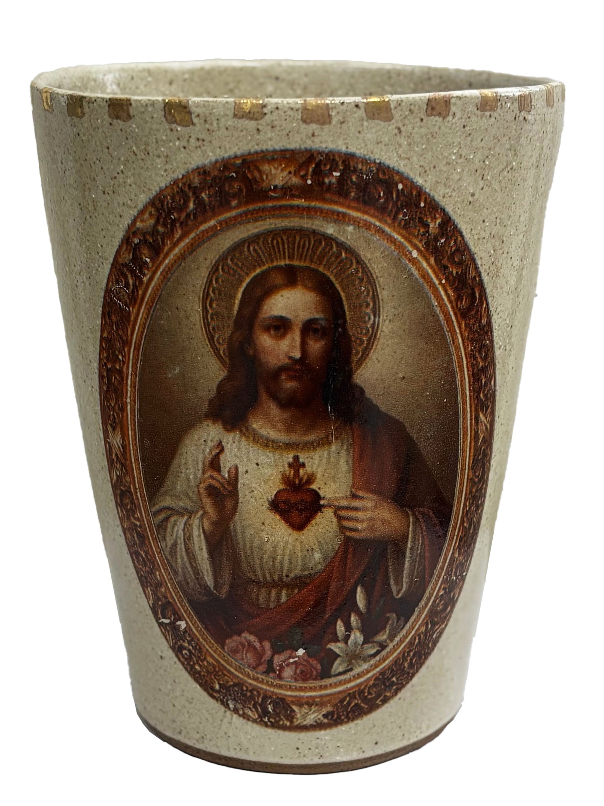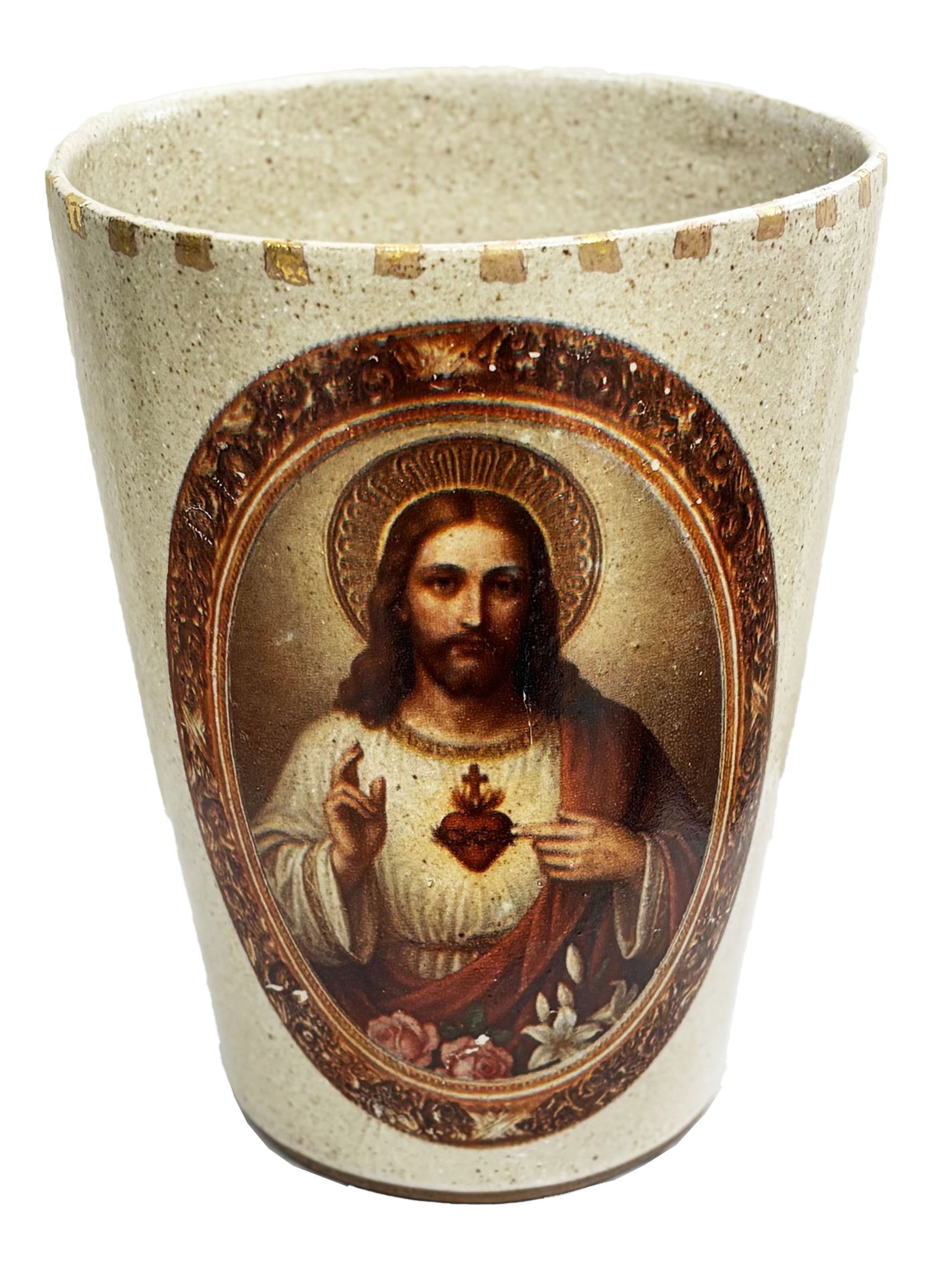 Estampa a figura de Jesus em uma moldura e tem leves pinceladas de ouro na borda.